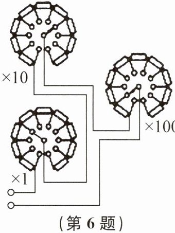 6. 某一旋钮式电阻箱内部结构如图所示,它由9个$100Ω$、9个$10Ω$和9个$1Ω$的电阻组成,当改变旋钮(即图中指针)位置调节电阻值时,相当于改变了电阻箱内部接入电路部分导体的
