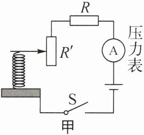 11. 小明用电流表和滑动变阻器设计了如图甲所示的压力测量仪,可以反映弹簧上方金属片受到的压力大小。其中是滑动变阻器,R是定值电阻,电源电压恒定不变,压力表实际上是一个电流表。