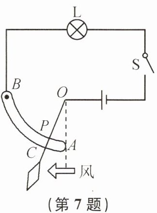 7. (2024·扬州江都月考)一位同学设计了一个风力测定仪,如图所示,O是转动轴,OC是金属杆,下面连接着一块受风板。无风时OC是竖直的,风越强,OC杆偏转的角度越大。AB是一段圆弧形电阻,P点是金属杆与圆弧形电阻相接触的点,电路中接有一个小灯泡,测风力时,闭合开关S即可。通过分析可知:金属杆OC与圆弧形电阻AB组合在一起相当于一个
