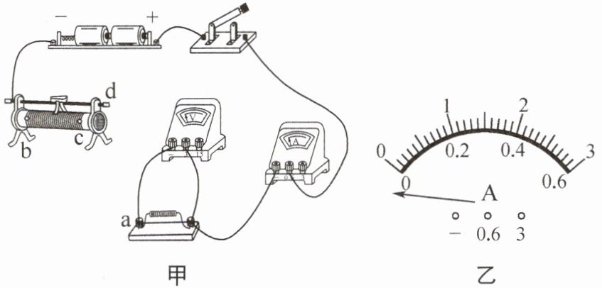 (填“b”“c”或“d”)接线柱,要求滑动变阻器的滑片向右滑动时,电流表的示数变大。(2)开关闭合前,小亮发现电流表的指针在“0”刻度线左侧,如图乙所示,若不调零,改变滑动变阻器阻值,电压表、电流表的示数分别为$U_1、$$U_2、$$I_1、$$I_2,若用\frac{U_1}{I_1}$作为R_x的测量结果与真实值比较,R_x的测量值____