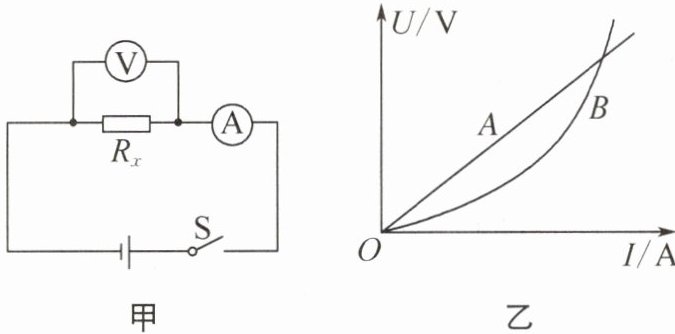 。他们利用改进后的电路进行实验,并绘制出R_x的电压-电流图像。如图乙所示的A、B两条图线中,A