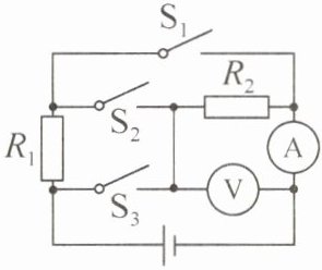 10 变大 0 提示:只闭合开关S₂时,R₁与R₂串联,电压表测R₂两端的电压,$R_{2}=\frac {U_{2}}{I}=\frac {3\ V}{0.3\ A}=10\ \Omega$;当断开开关S₂,闭合S₁、S₃时,R₁与R₂并联,电流表测干路电流,示数变大;当闭合开关S₁、S₂,断开开关S₃时,仅R₁工作,R₂和电压表被短路,电压表的示数为0。