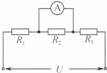 3. 如图所示,三个阻值均为 10 Ω 的电阻$R_{1}$、$R_{2}$、$R_{3}$串联后接在电压恒定为U的电路中。某同学误将一只电流表并联在电阻$R_{2}$两端,发现电流表的示数为 1.5 A,据此可推知电源电压U为