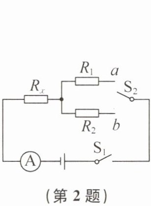 2. 如图所示,电阻$R_{1}$、$R_{2}$为定值电阻,电源电压保持不变。当开关$S_{1}$闭合,$S_{2}$接a端时,电流表的示数为I;当开关$S_{1}$闭合,$S_{2}$接b端时,电流表的示数为2I。则未知电阻$R_{x}$的阻值是(