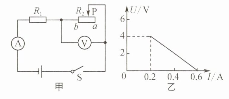 6. 如图甲所示,电源电压保持不变,$R_{1}= 10Ω$。闭合开关 S,滑动变阻器滑片 P 从a端移到b端,两电表的示数变化的关系如图乙所示。求: