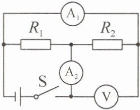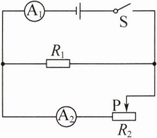 (2)$I_{2小}=\frac{U}{R_{2}}=\frac{6\ \text{V}}{20\ \Omega}=$$0.3\ \text{A}$,电流表$A_{1}$的最小电流$I_{小}=I_{1}+I_{2小}=$$0.2\ \text{A}+0.3\ \text{A}=0.5\ \text{A}$。