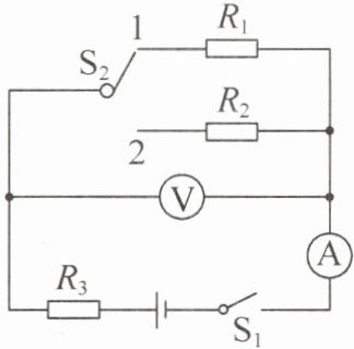 4. (2024·泰州高港期末)如图所示,电源电压不变,已知$R_{1}= 10Ω,$$R_{2}= 20Ω$。当开关$S_{1}$闭合、$S_{2}$接1时,电流表的示数为0.3A;当开关$S_{1}$闭合、$S_{2}$接2时,电压表的示数为4.5V。当开关$S_{1}$闭合,$S_{2}$由1接到2时,电压表的示数将