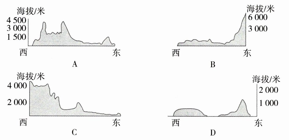 2. 下列四幅图中,能正确表示北美洲大陆沿 $40^{\circ}\text{N}$ 纬线的地形剖面的是 (