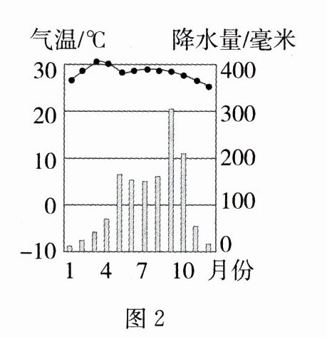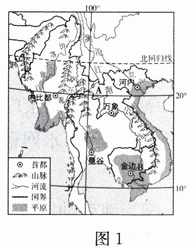 材料:东南亚与我国山水相连、人文相通、经济互补,是我国重要的贸易合作伙伴。我国每年从东南亚进口大量天然橡胶。图1是中南半岛河流与城市分布示意图,图2是万象气候资料图。