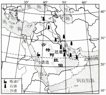 )①沙特阿拉伯水资源匮乏 ②阿拉伯半岛位于亚洲南部 ③土耳其火山、地震较多 ④波斯湾及其沿岸地区石油资源丰富