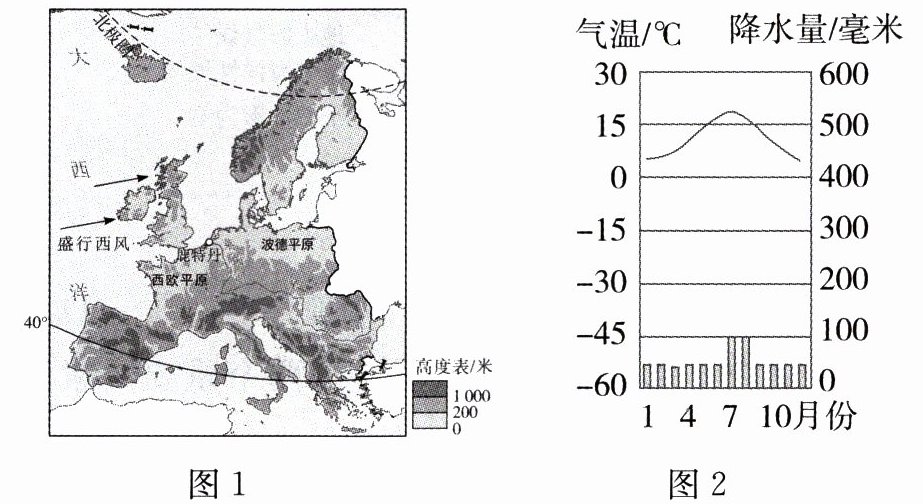 材料二:图1是欧洲西部地形图,图2是欧洲西部某城市气候资料图。