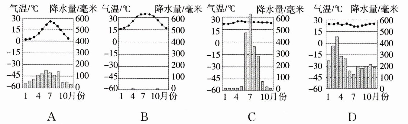 1. 根据下列图中信息判断,正确反映埃及大部分地区气候特征的图是 (