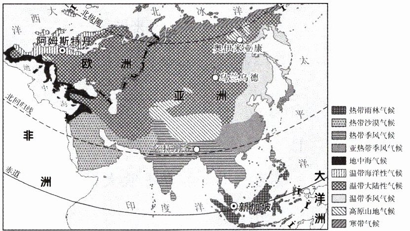 (1)图中可以看出亚欧大陆分布面积最广的气候类型是