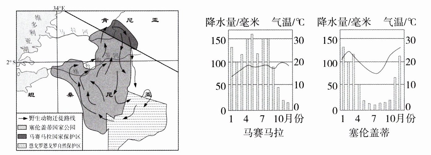 东非高原的角马等野生动物,每年从非洲坦桑尼亚的塞伦盖蒂国家公园向肯尼亚的马赛马拉国家保护区进行周期性的迁徙。读非洲野生动物迁徙路线图和相关气候资料图,完成6~8题。