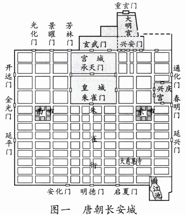 (2)唐朝长安有西市和东市,市与坊分开;北宋东京的商业活动已突破坊和市的界限,经商的时间不再受限制,出现了早市和夜市。