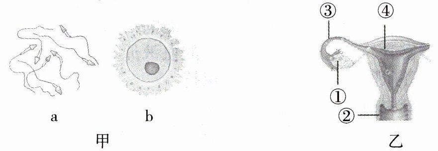 4. 图甲 a 和 b 分别是精子和卵细胞的示意图,图乙是女性生殖系统的结构示意图。请据图分析,下列说法错误的是(