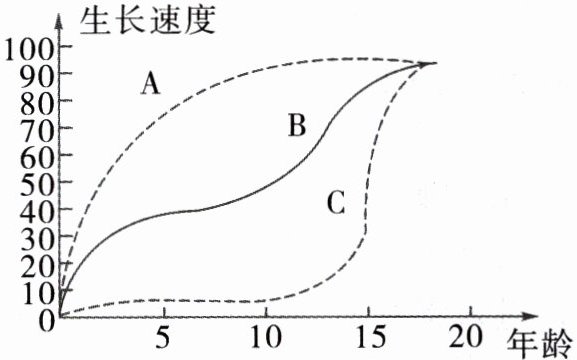 资料二:青春期是青少年身体和心理迅速发育直至成熟的一段时期。此时青少年的脑部结构和功能趋于完善,生殖器官开始迅速发育。如图所示,曲线A、B、C分别代表人身体不同部位(或器官)的生长速度。