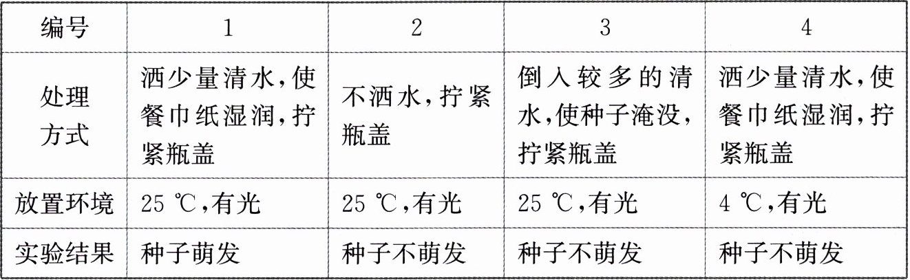 号瓶的实验结果说明充足的空气是种子萌发所必需的外界条件。(3)1号瓶和4号瓶的实验结果说明