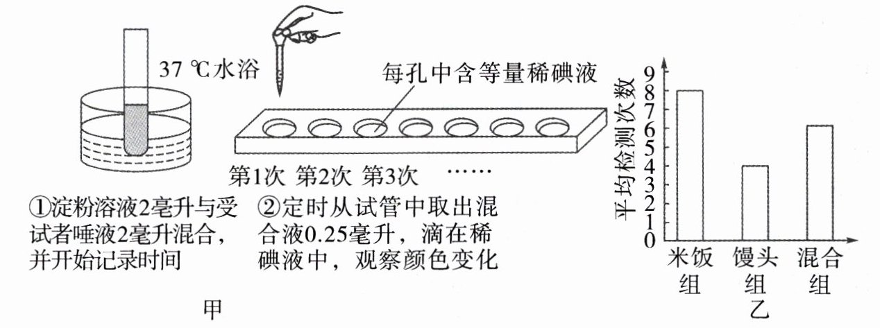 (1)同学们利用所学知识进行了调查研究。将在校生按照其惯常主食偏好,分成米饭组、馒头组、混合组(以米饭和馒头为主食),分别测试三组相同数量受试者的唾液对淀粉的消化能力。检验方法及结果分别如图甲、乙所示。