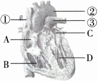 5. 右边是心脏的结构示意图(A、B、C、D代表心脏的四个腔,①②③表示血管),下列有关心脏结构、功能及工作过程的分析,不正确是(