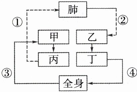 5. 血液循环为人体各个组织细胞不断运来营养物质和氧,运走二氧化碳等废物。下面是人体血液循环示意图,其中甲~丁代表心脏的四个腔,①~④代表血管。下列有关叙述正确的是(