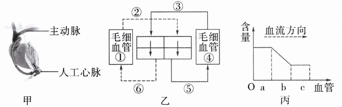 6. 胡盛寿院士及其团队将研制成功的第三代全磁悬浮人工心脏用于救治多例心衰患者,并获得成功。该技术为广大晚期心力衰竭患者重获新生带来希望。图甲表示人工心脏参与人体血液循环的工作方式,图乙是某同学绘制的人体血液循环流程图,图中①、②、③、④、⑤、⑥表示血管;图丙是血液流经某器官时一种物质含量变化的曲线图,图中a、b、c表示器官中相连的三种血管。回答下列问题。