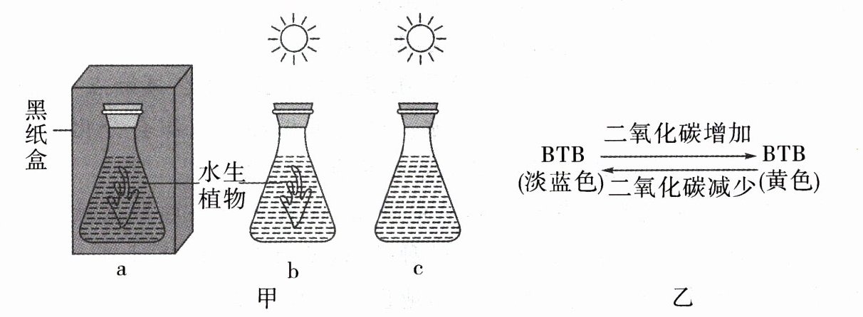 5. 图甲为“验证绿叶在光下吸收二氧化碳”的实验装置示意图,a、b、c三个锥形瓶内各滴入了等量的BTB溶液,并通入二氧化碳,使溶液由蓝色变成黄色(检测原理如图乙所示)。3小时后进行观察,溶液能够变成蓝色的是(