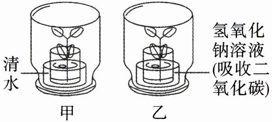 4. 右下图是检验“光合作用需要二氧化碳”的实验装置,一段时间后摘取甲、乙内的叶片放在酒精中水浴加热、染色,观察叶片颜色的变化。下列有关叙述错误的是(