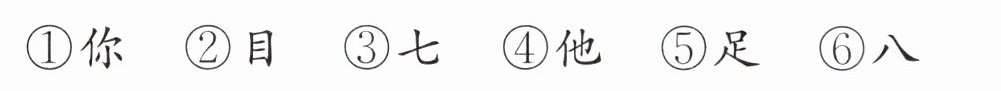 ①③ ②⑤ 解析 这道题考查按韵母给汉字分类。“他、八”的韵母都是a,“你、七”的韵母都是i,“目、足”的韵母都是u。
