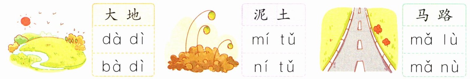 涂色:dà dì ní tǔ mǎ lù 解析 这道题考查生字的读音。声母 b 和 d 可以利用口诀“半圆在右 bbb、半圆在左 ddd”来区分。