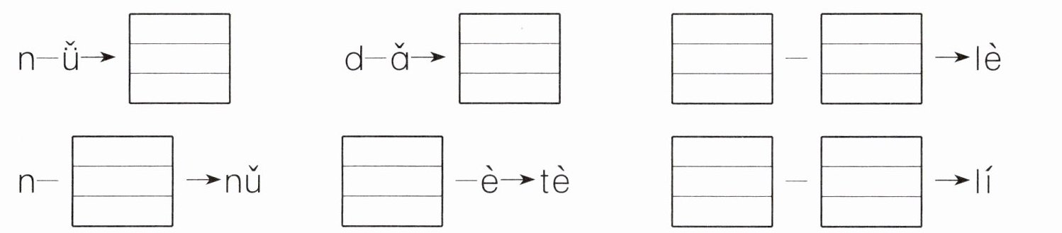 nǚ dǎ l è ǔ t l í 解析 这道题考查拼写音节。作答时,可以边读边做,如:声母 n,(带调)韵母 ǚ,组成音节 nǚ。
