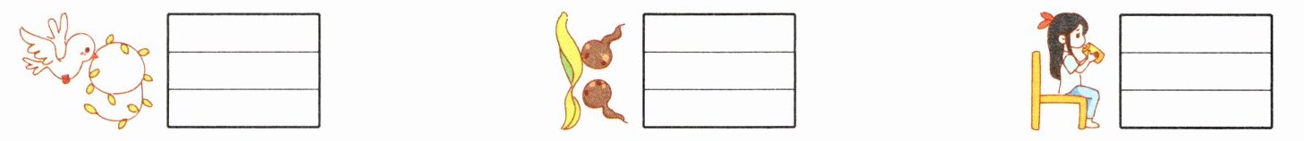 g k h 解析 这道题考查声母。第一幅图中鸽子衔的草环是声母 g 的形状,第二幅图中水草和两只蝌蚪形成了声母 k 的形状,第三幅图中小女孩坐的椅子是声母 h 的形状。注意 g 占四线格的中、下两格,k 和 h 占四线格的上、中两格。