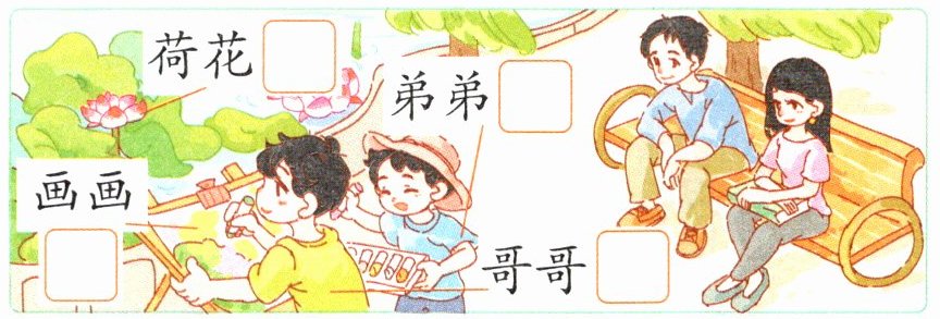 解析 这道题考查识字和对拼音的掌握。做题时先看图片,了解图片的内容,然后认读词语。“哥哥”的读音是“gē ge”,所以在旁边的方框里填①;“画画”的读音是“huà huà”,所以在旁边的方框里填③;“荷花”的读音是“hé huā”,所以在旁边的方框里填④;“弟弟”的读音是“dì di”,所以在旁边的方框里填②。