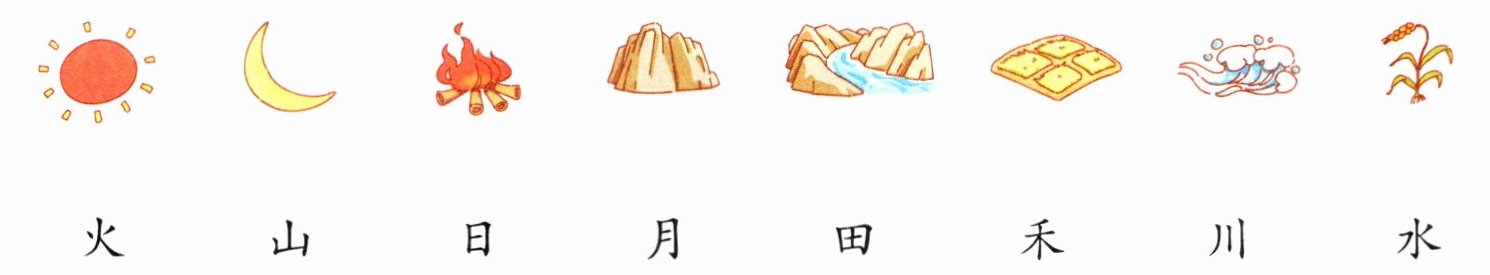 解析 这道题考查对象形字的认识和会写字。答题时,观察图片中哪些地方藏有象形字,把它们圈出来。通过观察可知,图中有7个象形字,分别是:木、山、田、水、日、火、禾。圈完再选出自己会写的4个字,正确地书写在田字格中。