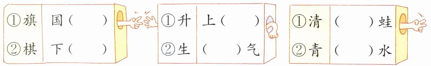 ① ② ① ② ② ① 解析 这道题考查同音字。“国旗”的“旗”是方字旁,多指用布、纸等材料做成的标志;“下棋”的“棋”是木字旁,是一种文娱用品名。“上升”与“下降”相对,“生气”多指不愉快。“青蛙”是一种小动物的名称;“清水”指水纯净没有混杂的东西,与水有关的字常用三点水。