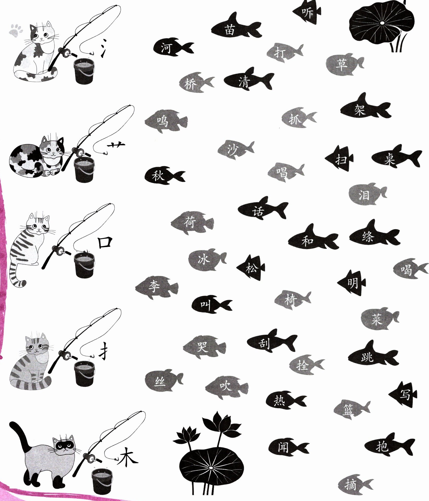 碧波荡漾的荷塘边,有几只小猫在钓鱼。小猫分别钓到了哪些鱼?请你帮小猫和小鱼配对,把“鱼”和对应的桶连线。