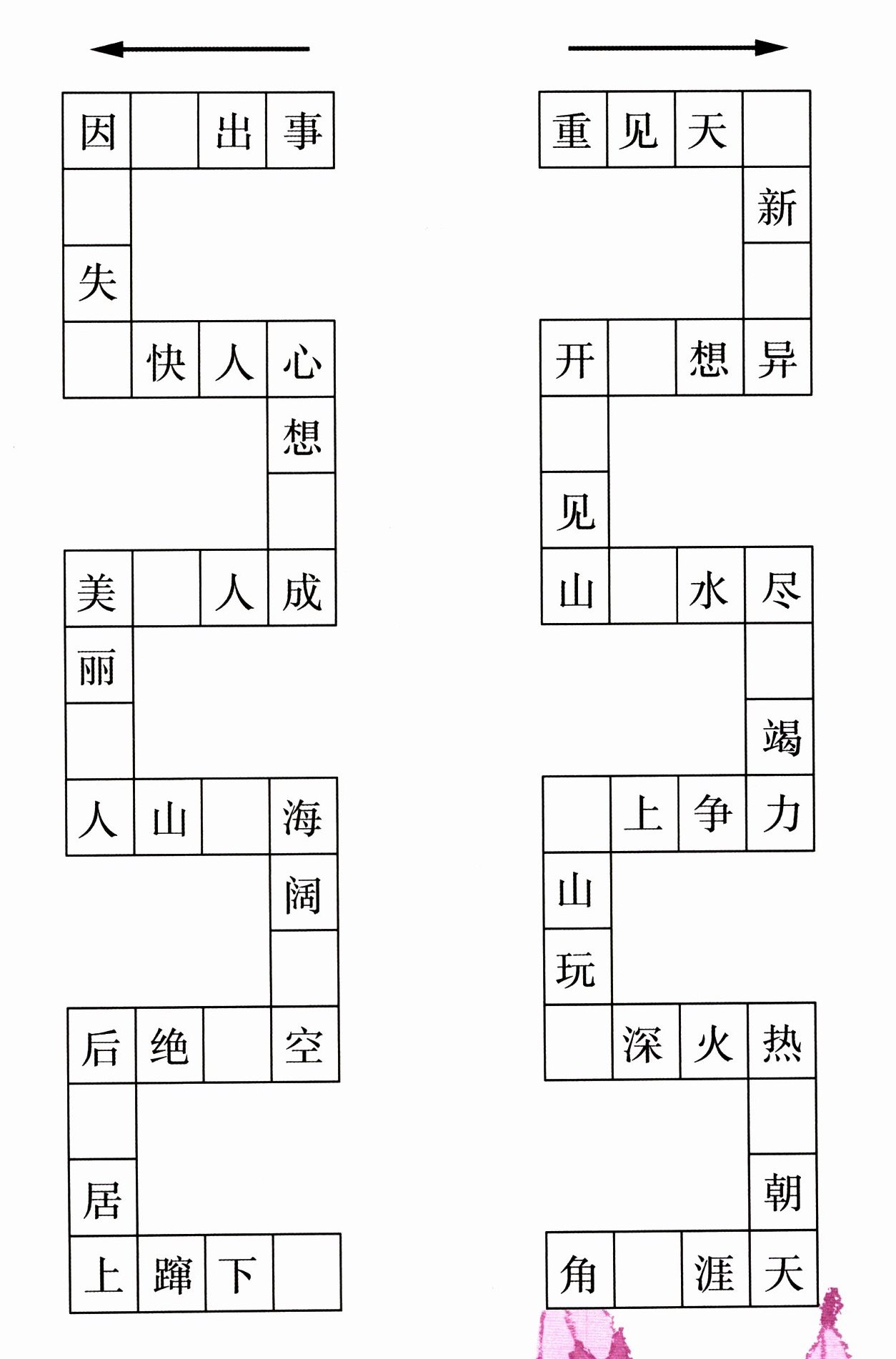 从箭头指示的方向开始,填上简单的字,完成这个有趣的成语接龙游戏吧!