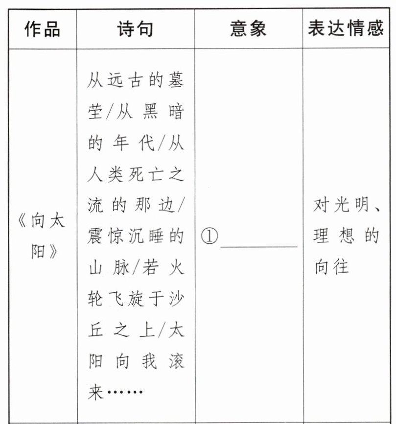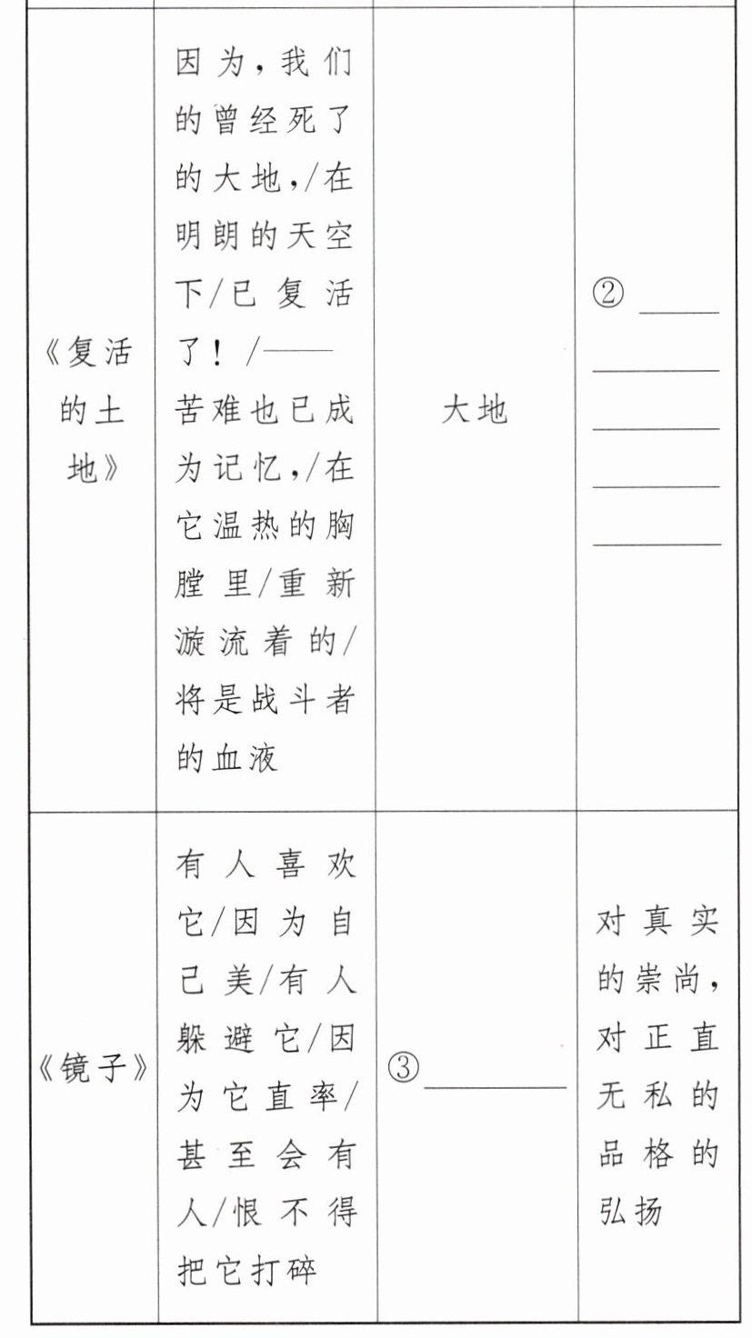 7. 《艾青诗选》收录了艾青人生各个时期的作品,其中描写了大量具有象征意味的事物。请你完成下面的表格。