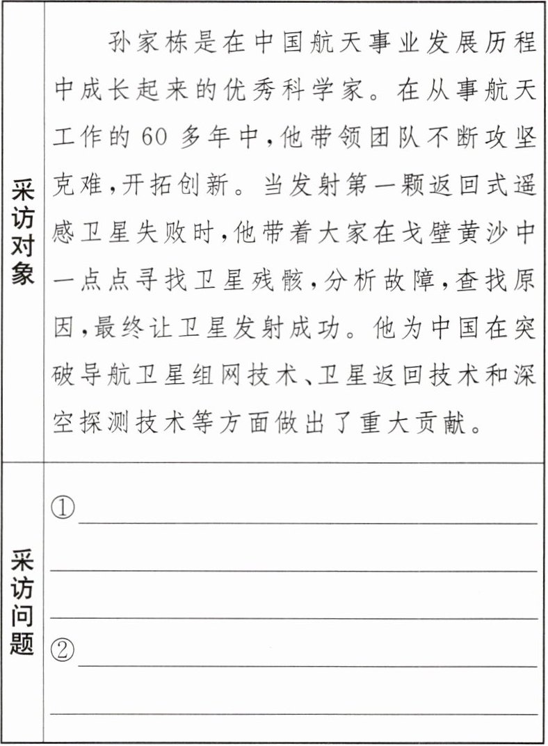6. 为了弘扬当代自强不息精神,学校计划让你以校报记者的身份去采访航天科学家孙家栋。为完善采访提纲,请你围绕“自强不息”拟写两个采访问题。