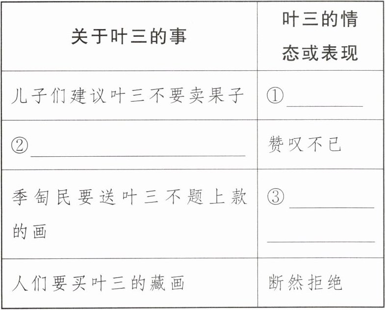 4.①生气 ②叶三观看季匋民作画 ③表明坚决不卖 5.A 【解析】A项,叶三对画作有鉴赏能力,与他成为出色的画家之间并没有必然的关系。"如果不卖果子,他一定会成为出色的画家"的说法不合逻辑。
