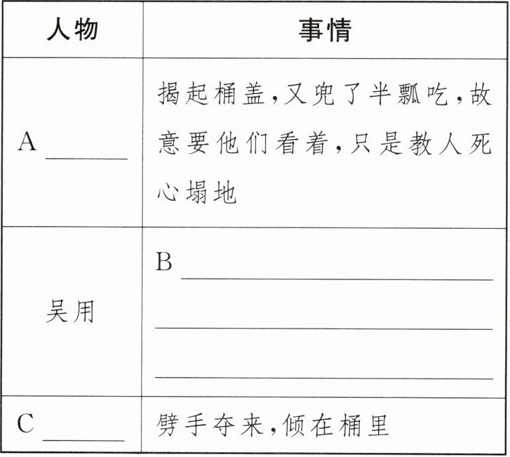 (1)晁盖听了吴用的计策,感叹“好妙计”“好计策”。这个计策实施的关键是下蒙汗药的时间和方式,对此他们做了精心安排。请根据小说情节,完成下表。