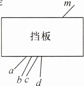 15. 如图,已知四条线段 $ a $,$ b $,$ c $,$ d $ 中的一条与挡板另一侧的线段 $ m $ 在同一条直线上,请借助直尺判断,该线段是(
