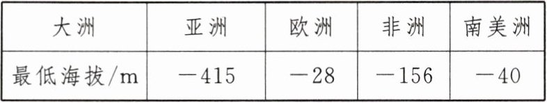 7. (2024·辽宁)亚洲、欧洲、非洲和南美洲的最低海拔如下表: