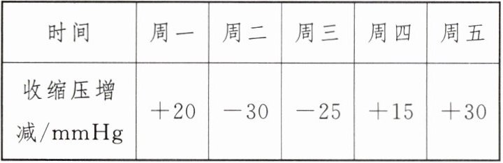 8. 某病人每天下午需要测量血压,该病人上周日收缩压为$120mmHg$.下表是该病人这周每天与前一天相比,收缩压的变化情况,则该病人本周五的收缩压是