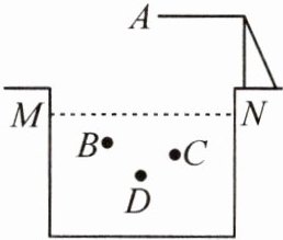 16. 如图,$MN$为一个泳池内的水平面.某跳水运动员(看作一个点)从点$A$处起跳,点$B$,$C$,$D$为他三次跳水后落入水中的位置,已知点$B$与点$D$的高度差是$1.5m$,点$C$与点$A$的高度差是$10.5m$.以水面为基准,在水面上方记为正,下方记为负,点$A$表示的是$+7.5m$,点$B$表示的是$-2m$,则点$B$比点$C$高多少?点$D$比点$A$低多少?