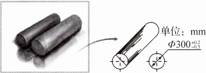 【知识背景】如图,在机械零件图纸上通常用$\varPhi 300_{-0.5}^{+0.2}$来表示轴的尺寸加工要求,这里 300 表示直径是 300 mm,$-0.5$和$+0.2$是指直径在$(300 - 0.5)mm$到$(300 + 0.2)mm$之间的产品都属于合格产品.