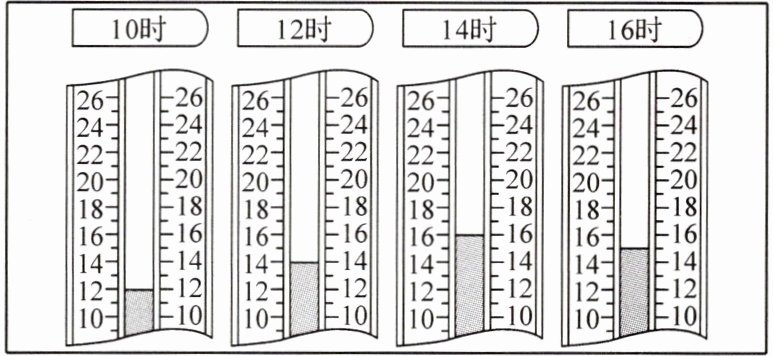 15. A|杭州外国语校本经典题 某天 10 时、12 时、14 时、16 时的气温如图所示.记 12 时的时间为 0,12 时以后的时间为正,请用正数和负数表示这四个时间及其气温,并填入下表.