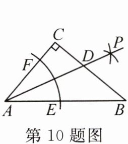 10. (2024·天津)如图,在Rt△ABC中,∠C=90°,∠B=40°,以点A为圆心,适当长为半径画弧,交AB于点E,交AC于点F;再分别以点E,F为圆心,大于$\frac{1}{2}EF$的长为半径画弧,两弧(所在圆的半径相等)在∠BAC的内部相交于点P;画射线AP,与BC相交于点D,则∠ADC的度数为(