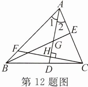 12. 如图,在△ABC中,∠1=∠2,G为AD的中点,连接BG并延长,交AC于点E,过点C作CH⊥AD于点H,延长CH交AB于点F。下列说法错误的是(