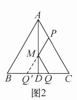 (1)小明提出的探究思路如下:如图 2,作点$Q$关于直线$AD$的对称点$Q'$,连接$PQ'$交$AD$于点$M$,连接$MQ$,根据“两点之间,线段最短”,可知此时$MP + MQ$的值最小.